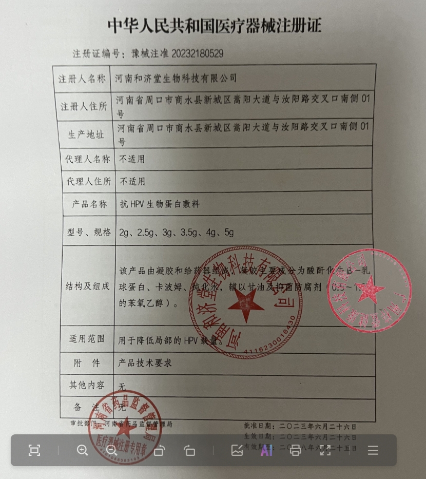 豫械注準(zhǔn)20252180531/鄭州大醫(yī)微創(chuàng)技術(shù)有限公司 有效期至:2030-07-01抗HPV生物蛋白敷料