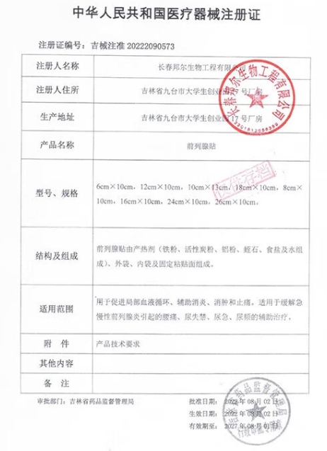 吉械注準(zhǔn)20222090654/吉林省格特生物科技有限公司 有效期至:2027-08-18前列腺貼