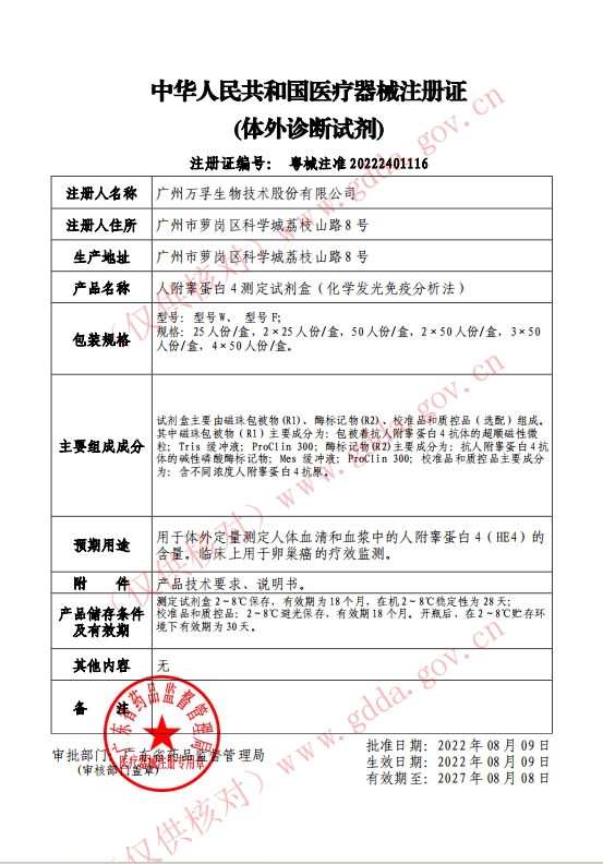 粵械注準(zhǔn)20222400539/深圳邁瑞生物醫(yī)療電子股份有限公司 有效期至:2028-04-19人附睪蛋白4測(cè)定試劑盒(化學(xué)發(fā)光免疫分析法)