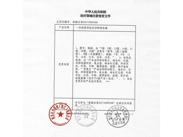 鄂械注準20172092427/湖北博康醫(yī)藥科技有限公司 有效期至:2017-01-12一次性使用包皮切割吻合器
