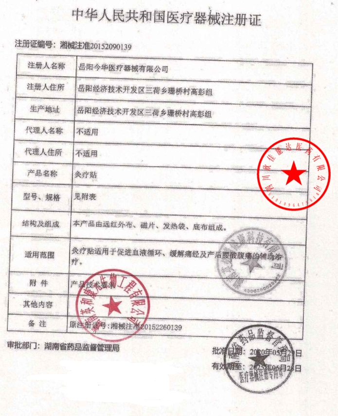 湘械注準20152260139/岳陽今華醫(yī)療器械有限公司 有效期至:2020-09-20灸療貼