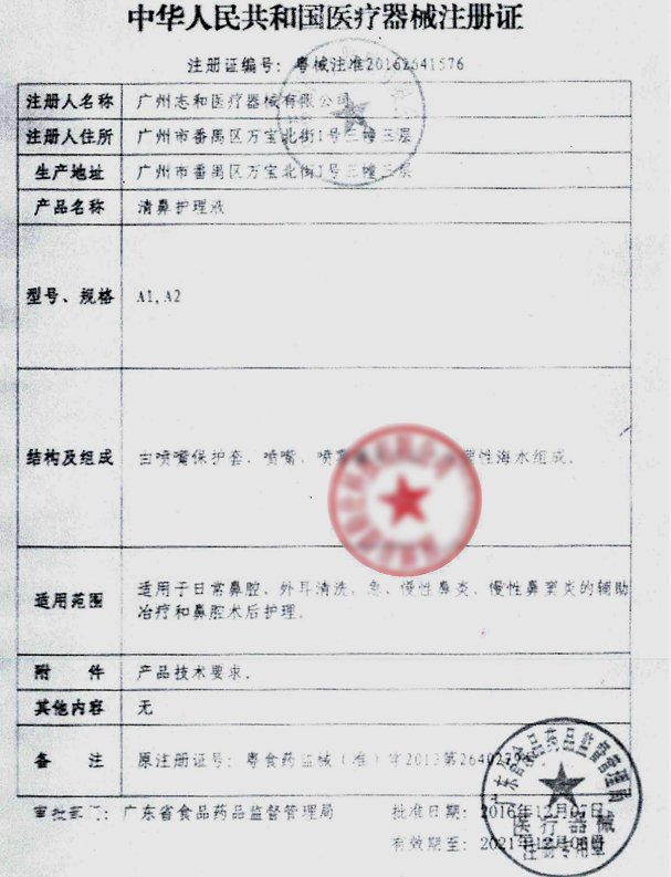 粵食藥監(jiān)械(準(zhǔn))字2013第2640279號(hào)/廣州志和醫(yī)療器械有限公司 有效期至:2017-03-19清鼻護(hù)理液