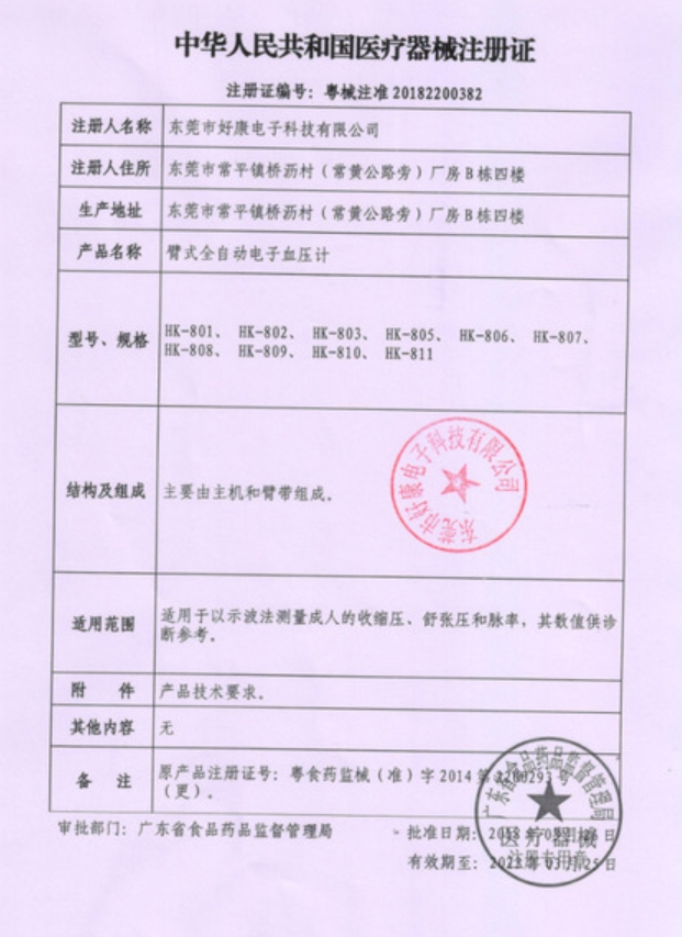 粵食藥監(jiān)械(準(zhǔn))字2014第2200293號(hào)(更)/東莞市好康電子科技有限公司 有效期至:2018-03-13臂式全自動(dòng)電子血壓計(jì)