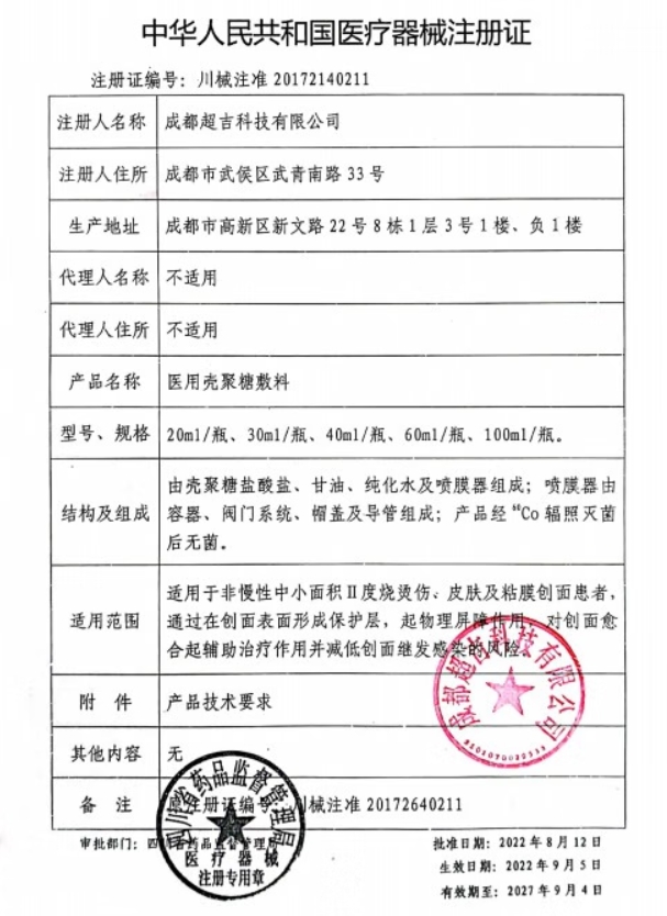 適用于非慢性中小面積Ⅱ度燒燙傷、皮膚及粘膜創(chuàng)面患者,通過在創(chuàng)面表面形成保護(hù)層,起物理屏障作用,對(duì)創(chuàng)面愈合起輔助治療作用并減低創(chuàng)面繼發(fā)感染的風(fēng)險(xiǎn)。