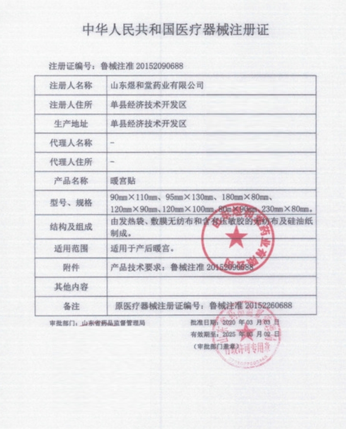魯械注準(zhǔn)20152090686/山東皇圣堂藥業(yè)有限公司 有效期至:2029-11-13暖宮貼