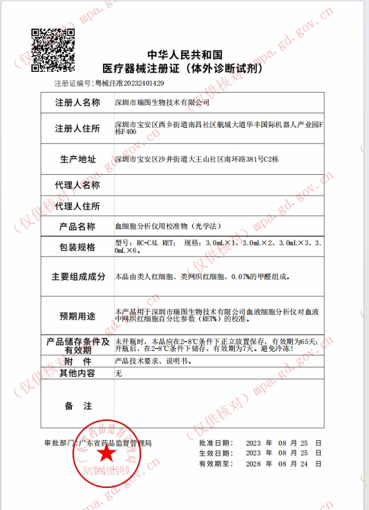 粵械注準20232400699/深圳市瑞圖生物技術(shù)有限公司 有效期至:2028-04-23血細胞分析儀用校準物(光學法)