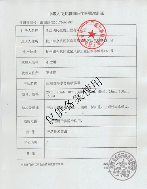 鄂械注準(zhǔn)20152642183/武漢啟捷科技開發(fā)有限公司 有效期至:2020-11-26生理性海水鼻腔噴霧器