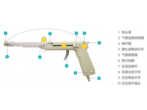 由槍體、槍管、彈力線、負(fù)壓吸引接頭、繞線輪、套扎器開關(guān)和蓋帽組成,其中A型配置3發(fā)彈力線;B型配置單發(fā)彈力線。
