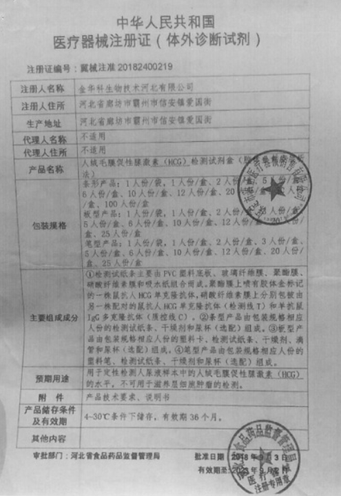 冀械注準(zhǔn)20202400167/金華科生物技術(shù)河北有限公司 有效期至:2030-04-12人絨毛膜促性腺激素(HCG)檢測試劑盒(膠體金免疫層析法)