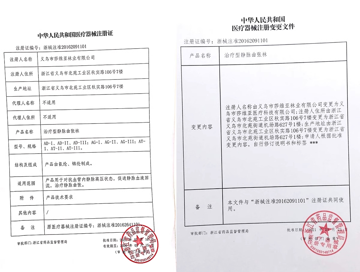 注冊人名稱由義烏市莎維亞襪業(yè)有限公司變更為義烏市莎維亞醫(yī)療科技有限公司;注冊人住所由浙江省義烏市北苑工業(yè)區(qū)秋實(shí)路106號7樓變更為浙江省義烏市北苑街道機(jī)場路627號1樓;生產(chǎn)地址由浙江省義烏市北苑工業(yè)區(qū)秋實(shí)路106號7樓變更為浙江省義烏市北苑街道機(jī)場路627號1樓;申請人根據(jù)批準(zhǔn)變更內(nèi)容,自行修訂說明書和標(biāo)簽。