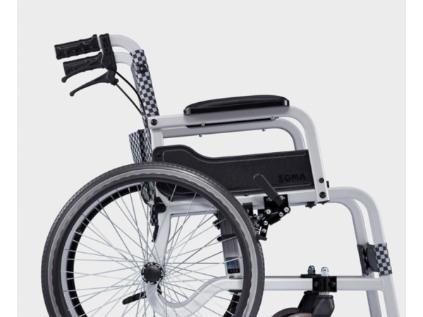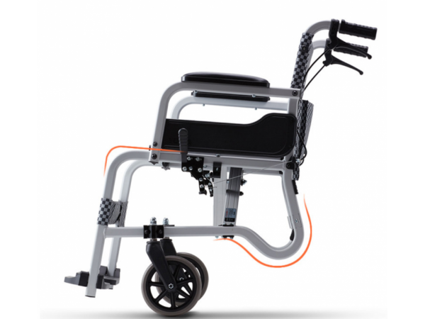 產(chǎn)品由前輪、后輪、靠背、固定扶手、靠腳、座墊、鋁合金輪椅骨架組成。