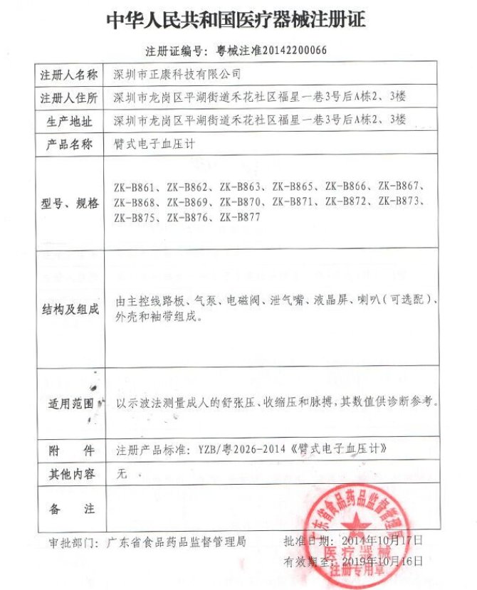 粵食藥監(jiān)械(準(zhǔn))字2012第2200789號/東莞譽(yù)康實(shí)業(yè)有限公司 有效期至:2016-11-11臂式電子血壓計(jì)