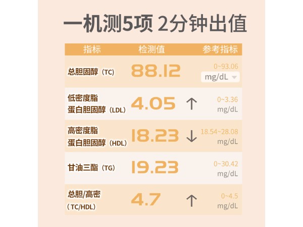 本產(chǎn)品與配套的血脂測試卡配合使用,用于定量檢測人體全血(毛細(xì)血管血或靜脈血)、血漿或血清中總膽固醇(CHOL)、高密度脂蛋白膽固醇(HDL)和甘油三酯(TRIG)的含量。