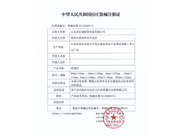 魯械注準(zhǔn)20152260315/山東世紀(jì)通醫(yī)藥科技有限公司 有效期至:2020-05-18熱奄包