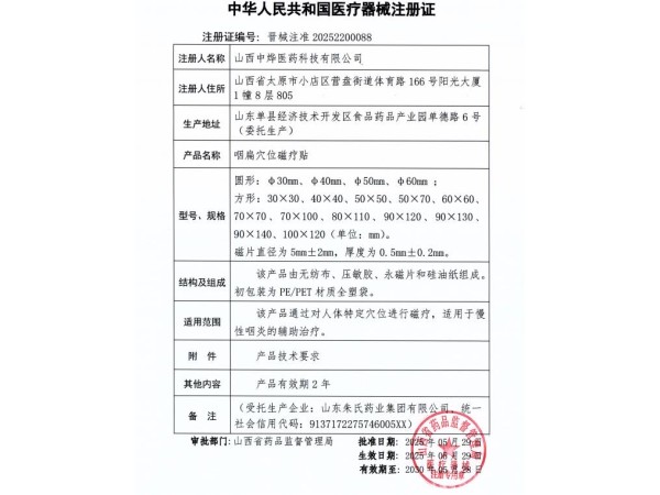 晉械注準(zhǔn)20242200039/山西健康動(dòng)力醫(yī)療科技有限公司 有效期至:2029-03-19咽扁穴位磁療貼
