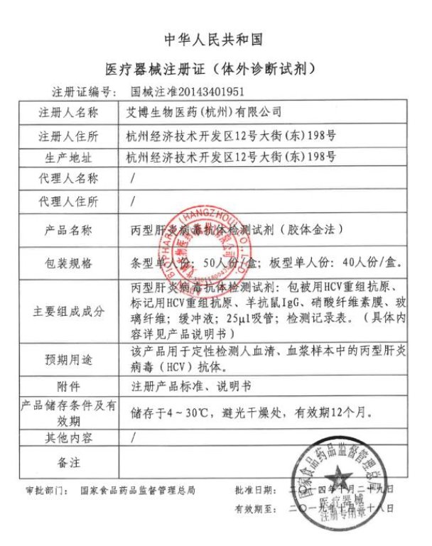 國械注準20163401254/杭州博拓生物科技股份有限公司 有效期至:2026-07-05丙型肝炎病毒抗體檢測試劑(膠體金法)