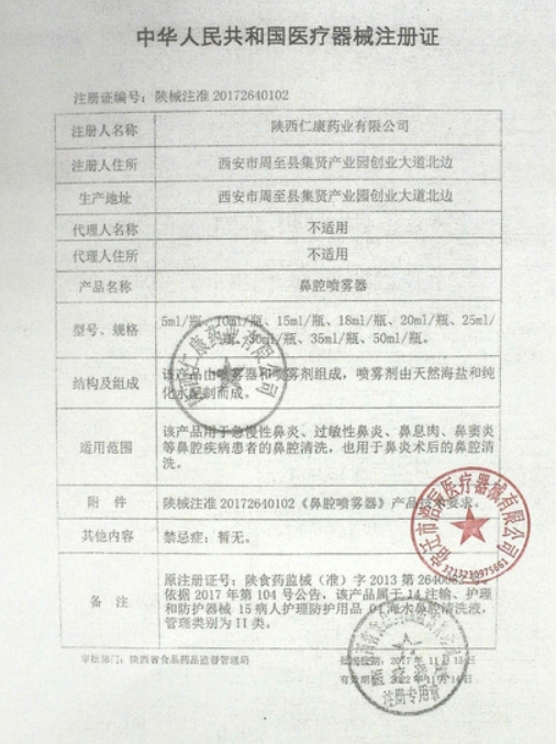 陜食藥監(jiān)械(準)字2013第2640082號/陜西仁康藥業(yè)有限公司 有效期至:2017-11-05鼻腔噴霧器