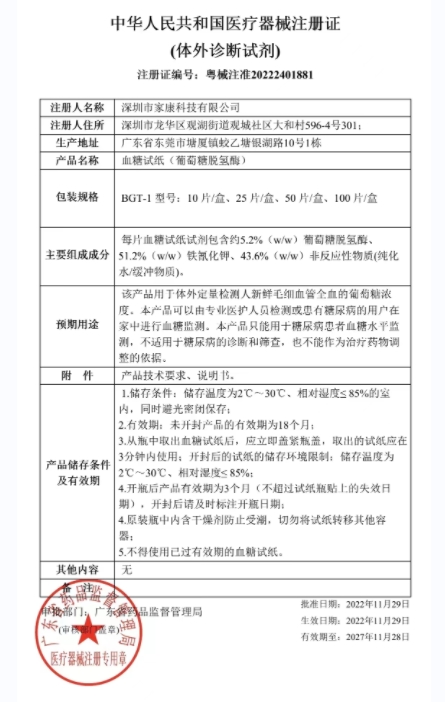 2023-03-10: 1、注冊證附件“產(chǎn)品技術(shù)要求”變更內(nèi)容見附頁1(共1頁);rn2、包裝規(guī)格由“BGT-1 型號:10 片/盒、25 片/盒、50 片/盒、100 片/盒”變更為:“BGT-1型號:10片/盒、25片/盒、50片/盒、100片/盒;10片/盒(單片包)、25片/盒(單片包)、50片/盒(單片包)、100片/盒(單片包)”;rn3、產(chǎn)品存儲條件及有效期由“1.儲存條件:儲存溫度為2℃~30℃、相對濕度≤ 85%的室內(nèi),同時避光密閉保存; 2.有效期:未開封產(chǎn)品的有效期為18個月; 3.從瓶中取出血糖試紙后,應(yīng)立即蓋緊瓶蓋,取出的試紙應(yīng)在3分鐘內(nèi)使用;開封后的試紙的儲存環(huán)境限制:儲存溫度為2℃~30℃、相對濕度≤ 85%; 4.開瓶后產(chǎn)品有效期為3個月(不超過試紙瓶貼上的失效日期),開封后請及時標(biāo)注開瓶日期; 5.原裝瓶中內(nèi)含干燥劑防止受潮,切勿將試紙轉(zhuǎn)移其他容器; 6.不得使用已過有效期的血糖試紙?!弊兏鼮?“1.儲存條件:儲存溫度為2℃~30℃、相對濕度≤ 85%的室內(nèi),同時避光密閉保存; 2.有效期:未開封產(chǎn)品的有效期為24個月; 3.從瓶中取出血糖試紙后,應(yīng)立即蓋緊瓶蓋,取出的試紙應(yīng)在3分鐘內(nèi)使用;開封后的試紙的儲存環(huán)境限制:儲存溫度為2℃~30℃、相對濕度≤ 85%;rn4.開瓶后產(chǎn)品有效期為3個月(不超過試紙瓶貼上的失效日期),開封后請及時標(biāo)注開瓶日期; 5.原裝瓶中內(nèi)含干燥劑防止受潮,切勿將試紙轉(zhuǎn)移其他容器; 6.不得使用已過有效期的血糖試紙?!?rn4、注冊證附件“產(chǎn)品說明書”變更內(nèi)容見附頁2(共1頁)。