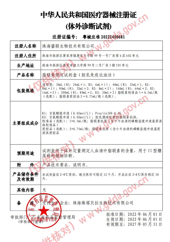 粵械注準(zhǔn)20232401352/廣州達(dá)泰生物工程技術(shù)有限公司 有效期至:2028-08-09脂聯(lián)素測(cè)定試劑盒(膠乳免疫比濁法)