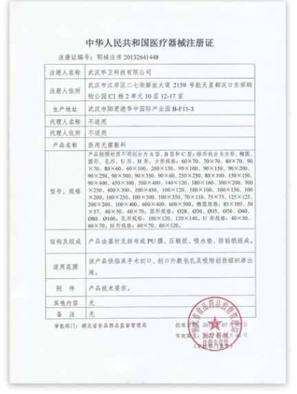 鄂械注準20222143827/武漢華衛(wèi)科技有限公司 有效期至:2027-06-30醫(yī)用無菌敷料