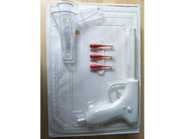 肛腸套扎器由槍體(內(nèi)置彈簧)、外槍管、內(nèi)槍管、硅膠圈(4個)、負壓吸引接頭 、繞線輪、套扎器開關和蓋帽組成。其中槍體(內(nèi)置彈簧)、負壓吸引接頭、繞線輪采用ABS塑料制成,外槍管、內(nèi)槍管、套扎器開關和蓋帽采用軟聚氯乙烯制成,硅膠圈采用醫(yī)用硅橡膠制成。產(chǎn)品應無菌。