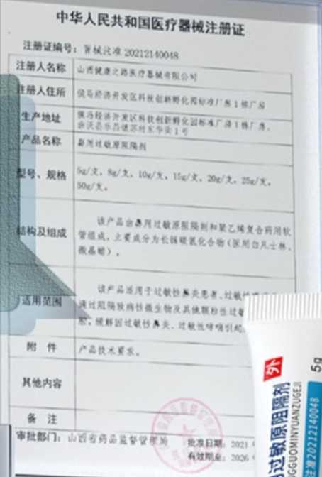 晉械注準(zhǔn)20242140046/山西健康之路醫(yī)療器械有限公司 有效期至:2029-03-19鼻用過(guò)敏原阻隔劑