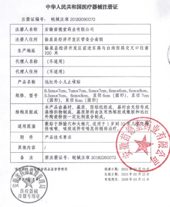 皖械注準(zhǔn)20182560072/安徽苗德堂藥業(yè)有限公司 有效期至:2023-03-11遠(yuǎn)紅外小兒止咳貼
