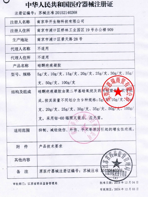 蘇械注準(zhǔn)20152640268/南京華開生物科技有限公司 有效期至:2020-03-04硅酮疤痕凝膠