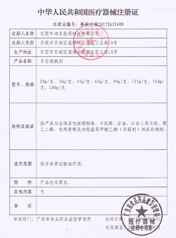 粵械注準(zhǔn)20172171409/東莞市鴻元醫(yī)藥科技有限公司 有效期至:2027-08-08牙齒脫敏劑