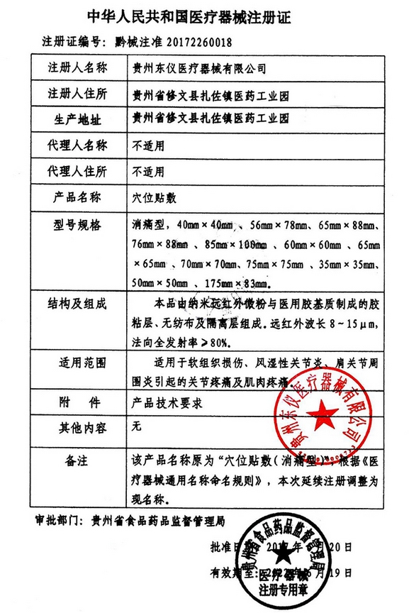 黔械注準(zhǔn)20192090010/貴州東儀醫(yī)療器械有限公司 有效期至:2024-01-07穴位貼敷