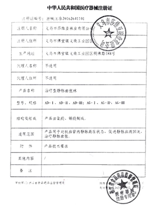 浙械注準20162091101/義烏市莎維亞醫(yī)療科技有限公司 有效期至:2026-07-15治療型靜脈曲張襪