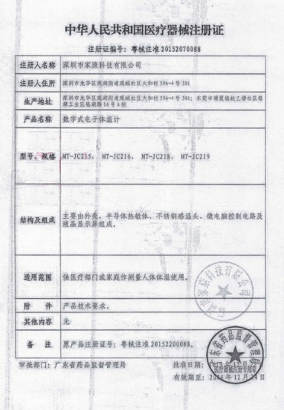 粵械注準(zhǔn)20152200088/深圳市家康科技有限公司 有效期至:2024-12-24數(shù)字式電子體溫計(jì)