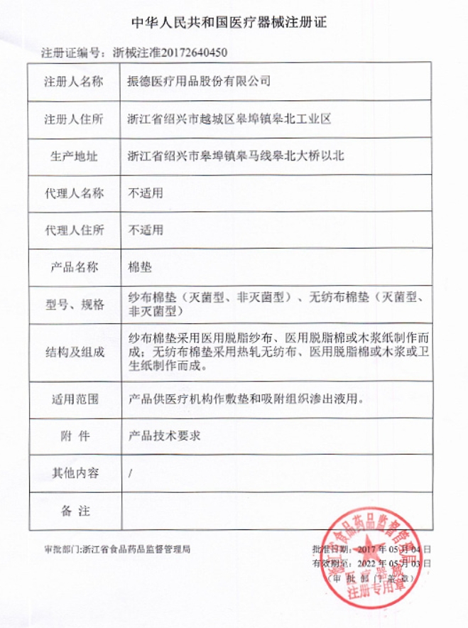 浙食藥監(jiān)械(準(zhǔn))字2013第2640156號/紹興振德醫(yī)用敷料有限公司 有效期至:2017-03-05棉墊
