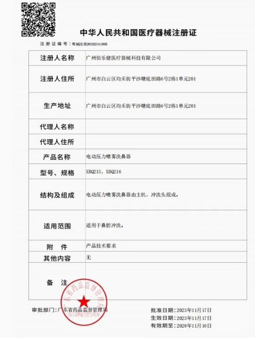粵械注準(zhǔn)20232140278/深圳市景欣泰家居用品有限公司 有效期至:2028-02-16電動(dòng)壓力噴霧洗鼻器