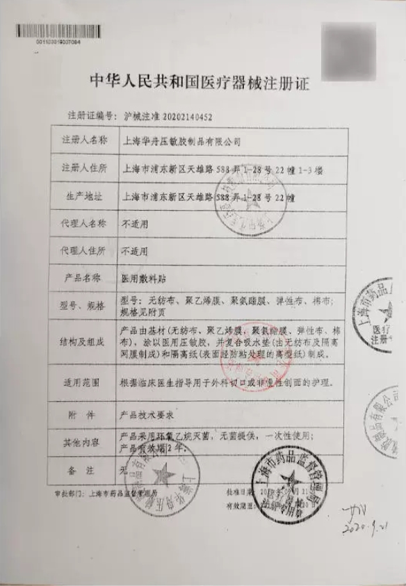 滬械注準20152640281/上海華舟壓敏膠制品有限公司 有效期至:2020-05-18醫(yī)用敷料貼