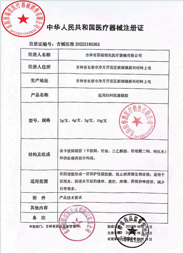 吉械注準(zhǔn)20242180119/吉林省國械領(lǐng)航醫(yī)療器械有限公司 有效期至:2029-04-24醫(yī)用婦科阻菌凝膠