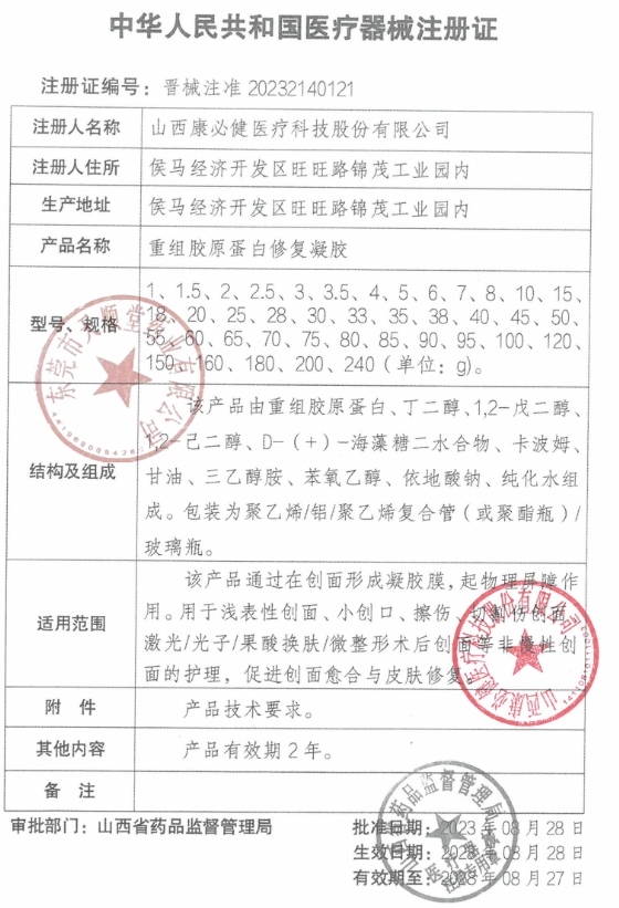 晉械注準(zhǔn)20232140154/山西銀藥師醫(yī)藥有限公司 有效期至:2028-10-29重組膠原蛋白修復(fù)凝膠