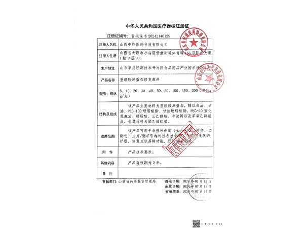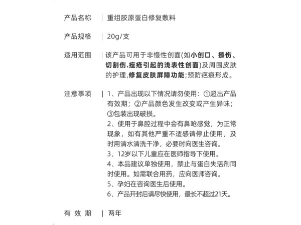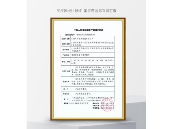 陜械注準(zhǔn)20142140018/陜西巨子生物技術(shù)有限公司 有效期至:2028-08-19重組膠原蛋白修復(fù)敷料