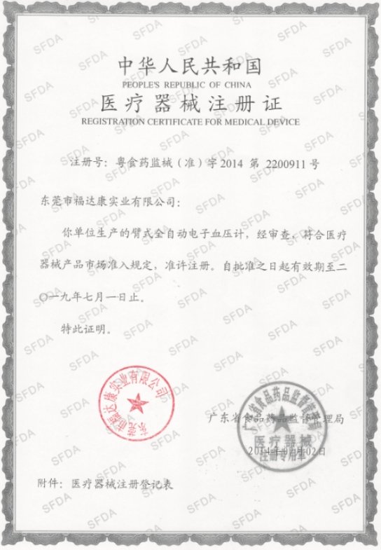 粵食藥監(jiān)械(準(zhǔn))字2014第2200780號(hào)/東莞市福達(dá)康實(shí)業(yè)有限公司 有效期至:2019-06-23臂式全自動(dòng)電子血壓計(jì)