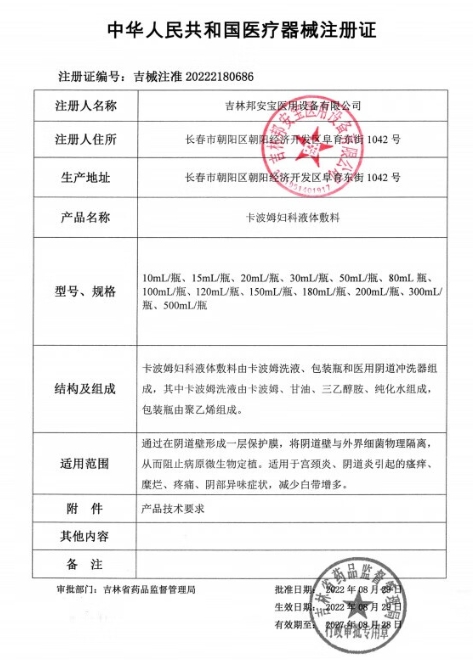 吉械注準20232180622/一正集團吉林省醫(yī)藥科技實業(yè)有限公司 有效期至:2028-12-23卡波姆婦科液體敷料