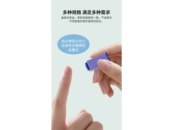 產(chǎn)品特點和優(yōu)勢安全————a、穿刺裝置自毀性設(shè)計保證產(chǎn)品只能一次性使用。 b、穿刺完畢,針尖自動回縮并鎖定在采血器內(nèi),完全保障醫(yī)護人員不被意外扎傷而感染。 c、針尖100%封閉設(shè)計,杜絕與空氣有任何接觸,保證出廠滅菌效果。 d、產(chǎn)品經(jīng)德國專業(yè)滅菌機構(gòu)Synergy Health 公司伽馬射線滅菌,射線滅菌無盲區(qū),比氣體滅菌更可靠,5年滅菌有效期確保使用安全。 e、面向全球的大批量全自動化生產(chǎn)保證產(chǎn)品質(zhì)量安全、可靠。頂部按壓、側(cè)面防滑設(shè)計————- a、一次性彈射回縮,不需施加過大壓力在病人采血部位,降低病人對采血過程的緊張感。 b、側(cè)面防滑設(shè)計,方便護士穿戴手套操作。增強操作輕松感、提高采血效率——————- a、具有親和力的外觀顏色設(shè)計,降低病人對采血過程的緊張感,采血更快捷、高效。 b、穿刺過程中,病人和護士都不會接觸和看到銳利的針尖,降低病人對采血過程的緊張感,采血更快捷、高效。 c、強大的擊發(fā)彈簧、大孔徑回縮彈簧的雙彈簧設(shè)計,發(fā)射后瞬間彈回,避免針尖彈射時呈弧形、曲線、旋轉(zhuǎn)式彈出而引起劇烈疼痛。全自動、精細的針尖研磨技術(shù)————- 超尖圓弧三棱狀的特殊設(shè)計,精細的針尖研磨技術(shù)保證了針尖切割面光潔無倒刺、鋒利,使得痛感小、創(chuàng)口小、愈合快、保證出血量。規(guī)格齊全—————— 6種規(guī)格選擇,采血更精準、可靠、輕松。