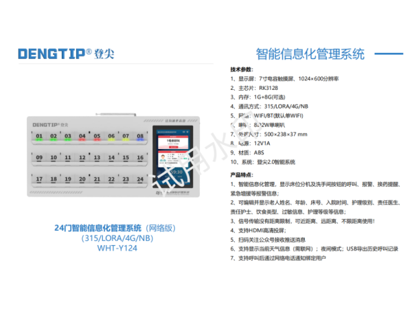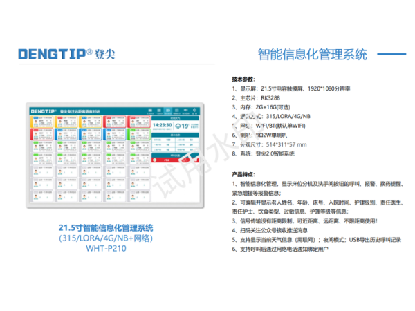 產(chǎn)品特點(diǎn):1、智能信息化管理,顯示床位分機(jī)及洗手間按鈕的呼叫、報(bào)警、換藥提醒、緊急增援等報(bào)警信息;2、可編輯并顯示老人姓名、