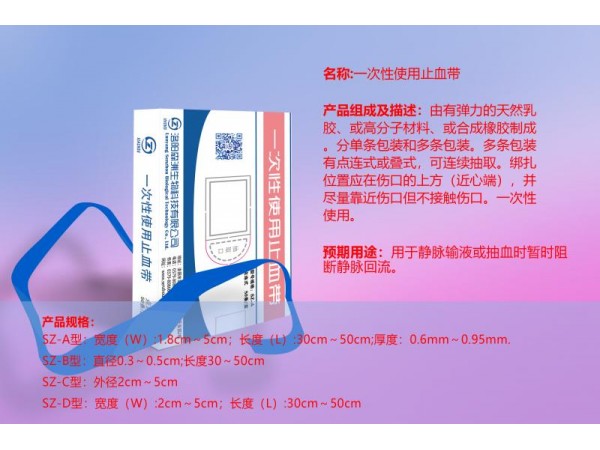 一次性使用止血帶介紹用于醫(yī)療救治中常規(guī)靜脈輸液、抽血、輸血?!夺t(yī)院感染管理辦法》第十二條醫(yī)療機(jī)構(gòu)應(yīng)當(dāng)按照《消毒管理辦法》