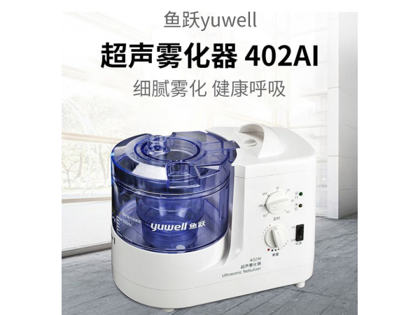 技術參數:電源電壓:AC220v±10%,50Hz±1Hz消耗功率:50VA超聲頻率:1.7MHz±10%最大霧化率:≥3ml/min連續(xù)加載時間:≥4小時水槽裝水量:300ml小霧化杯最大裝水量:150ml大霧化杯最大裝水量:350ml設備類型:II類B型超聲霧化器402A能將水溶劑藥物霧化成極微小的霧粒,作為病人氣霧吸入治療或表面病灶噴藥治療,對鼻炎、咽炎、急慢性支氣管炎、肺氣腫、哮喘、肺部或皮膚感染等有顯著療效,是國內外醫(yī)院內外科、兒科、五官科、皮膚科以及養(yǎng)老院等單位必備的醫(yī)療設備。產品類別: 醫(yī)用電子設備系列霧化器使用方法A、開機前準備1、開關、旋鈕放至適當位置2、水槽加水(350ML)3、霧化杯內注入藥液,逆順序裝好透明塑料各部件魚躍霧化器產品用途: (一)該產品是一種多功能霧化治療機。它能在常溫下,把水溶劑藥物,霧化成其微小霧粒,供病人吸入治療。(二)該機霧粒直徑,最小達0.2微米,可隨皮膚呼吸滲透人體細胞內。(三)對鼻炎、咽炎、氣管炎等呼吸道感染及皮膚病,術后化痰等,用霧化器,可把藥直接送到患處,見效快、療程短,避免打針、吃藥帶來的副作用。(四)可空氣消毒加濕,凈化空氣中的浮塵物。(五)可美容,能使多種維生素液,滲透到肌膚深層,為肌膚提供充足水份營養(yǎng)。魚躍霧化器開機工作1、打開電源開關,電源指示燈亮,風機工作(如水槽內水位過低或沒加水,此時水位指示燈亮、報警聲響,請關機加水)。2、霧量控制旋鈕,風量調節(jié)旋鈕至自定要求(霧量控制、風量調節(jié)旋鈕最佳設置:霧量控制旋鈕旋至最大,風量調節(jié)旋鈕置大小變化段的中間位置,此時霧濃,藥液利用率高。如要求送霧快、霧化率大,可加大風量)并把咬嘴或面罩接至病人。(根據需要可使用定時器)。3、若霧化的藥液量少,請調小霧量和風量旋鈕至送出薄霧即可,或請遵醫(yī)囑。4、藥液霧化完后,逆時針旋開霧化杯上蓋,取霧化杯時,應防止水滴入風道口,如不慎將水或藥液滴入風道,(機箱通風口下有"—"30mL水槽,水槽有排水孔)水可及時排出機外。(嚴禁大量的水涌入風道口,如發(fā)生應關機,并切斷電源將機器后側提高,將余水從排水管排出機外,并打開機箱檢查)超聲霧化器使用后整理關機后取下霧化杯水槽上蓋,講本機頭部傾斜倒出水槽內的水,并擦凈水槽和晶片(防止氧化和積垢,否則將影響晶片壽命),若連續(xù)使用可不倒水,但一天工作完應將水槽內水倒凈