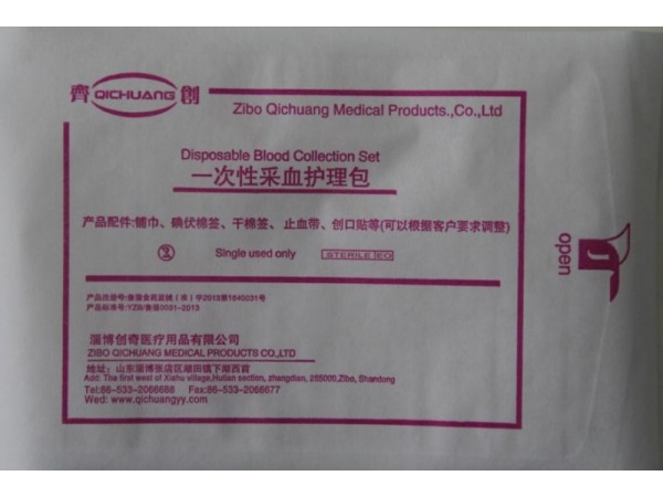 使用范圍:醫(yī)院和體檢中心抽取血樣、輸液及無償獻血時消毒止血用;使用時限:本產(chǎn)品為環(huán)氧乙烷滅菌處理,有效期兩年;產(chǎn)品配置:1.無菌墊巾;30cm*30cm 2.大容量消毒碘棒(2根);13cm 3.一次性止血帶;45cm*2.8cm*0.75cm 4.防水敷料貼;6cm*7cm 5.固定管路膠帶(2條)1.5cm*9cm 可選配置:1.醫(yī)用消毒濕巾; 2.自粘性繃帶;包 裝:醫(yī)療器械專用紙塑袋封裝,滅菌更徹底,側(cè)邊有拇指切,方便拆袋;