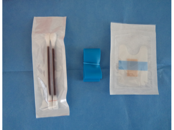 護理型由基本配置一次性使捆扎止血帶、一次性使用輸液貼和可選用配置碘伏棉簽、醫(yī)用棉簽、包布、醫(yī)用酒精棉簽、一次性使用治療巾