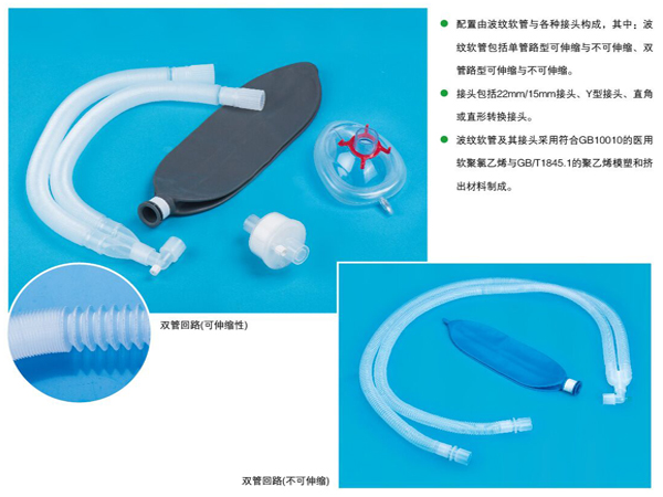 麻醉機(jī)呼吸機(jī)回路管分為麻醉機(jī)回路管和呼吸機(jī)回路管,麻醉機(jī)回路管由Y型接頭、回路管、過(guò)濾器、儲(chǔ)氣囊、面罩組成,呼吸機(jī)回路管