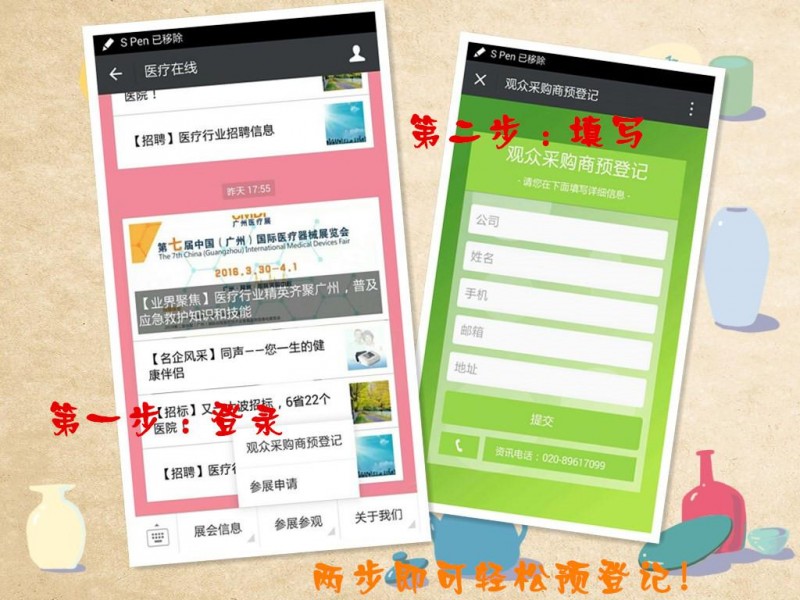 網(wǎng)上預(yù)登記:登陸官方網(wǎng)址http://www.cmdfair.com填寫“參觀報(bào)名登記表”,完整填寫相關(guān)信息。