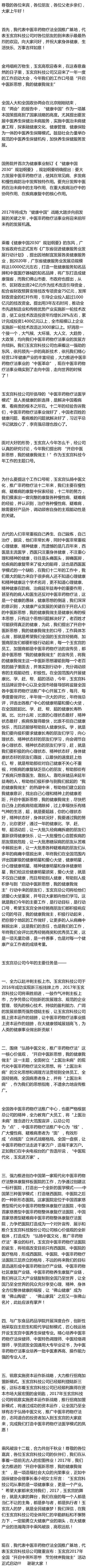 我是玉玄宮廣東中山地區(qū)的經(jīng)銷商,非常榮幸能代表玉玄宮“中醫(yī)非藥物療法”全體經(jīng)銷商,跟大家交交心。今天上午聽(tīng)了各位領(lǐng)導(dǎo)的講話,還看到這么多顧客充滿精氣神的表演,我非常激動(dòng)。親眼看到我們的事業(yè)有這么光明的前景,能給百姓帶來(lái)這么大的福氣,感到自己跟著玉玄宮走在推廣中醫(yī)非藥物療法的道路上,實(shí)在幸運(yùn),實(shí)在英明!