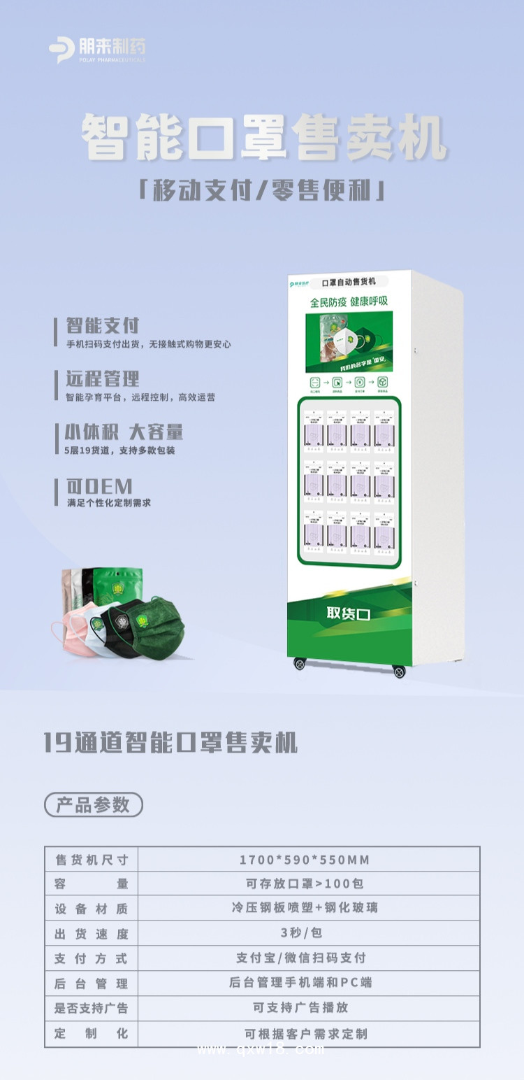 朋來制藥口罩自助售賣機(jī)于4月10日全面啟用,所售口罩為正規(guī)醫(yī)療器械文號(hào),價(jià)格親民,口罩廠家直銷,沒有中間商賺差價(jià)??钍角啻簳r(shí)尚靚麗,有國安球迷定制款醫(yī)用外科,兒童繪畫醫(yī)用口罩,馬卡龍色醫(yī)用口罩,方便市民出行防護(hù)需求。